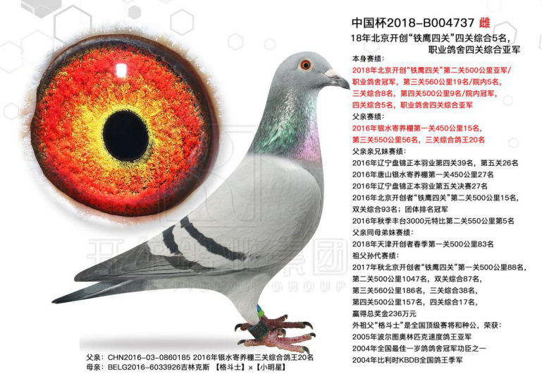 【神奇小鸟737】:2018年北京开创院内2次单关冠军,综合鸽王5名,这羽杨欧瓦克神奇小鸟成为当年开尔战队的头号功臣,各项指定赢得奖金3500万和1辆劳斯莱斯、4辆奔驰车!为开尔成为开创最大赢家立下汗马功劳。