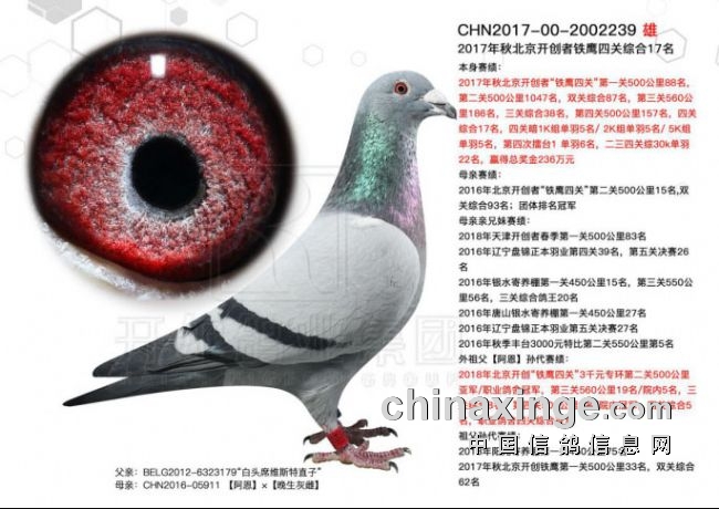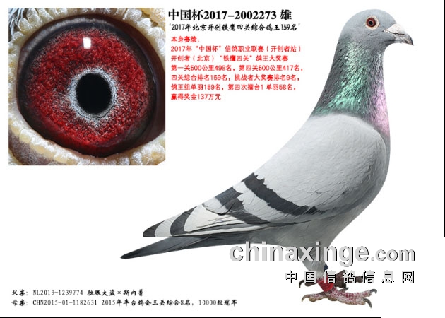 2017年北京开创者双关综合45名,四关综合19名,职业鸽舍公开赛亚军,赢得总奖金489万元