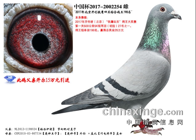 2017年北京开创者鸽王组单羽198名,赢得总奖金25万元