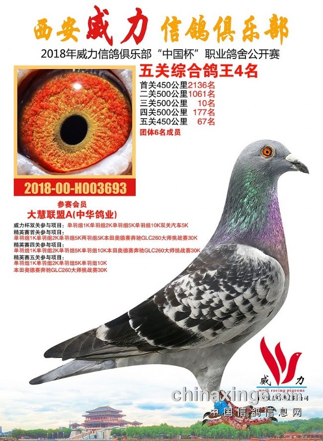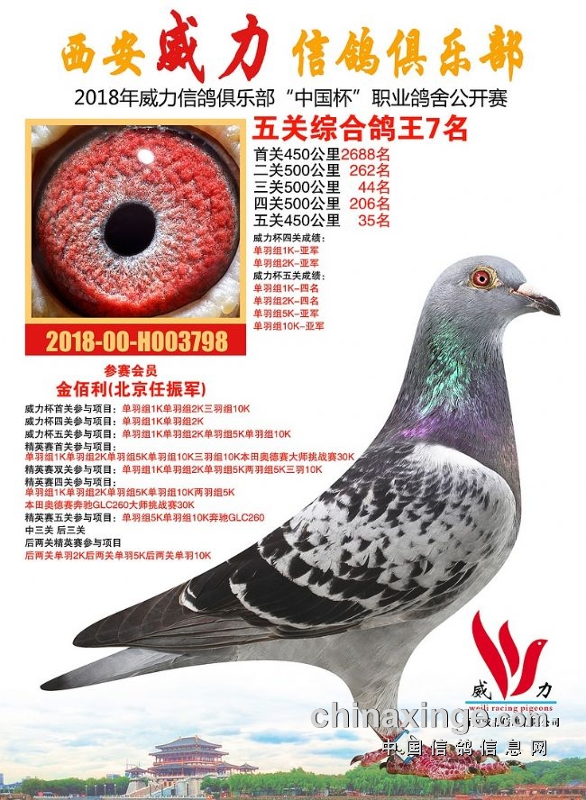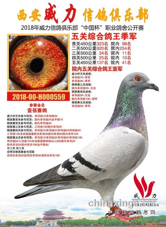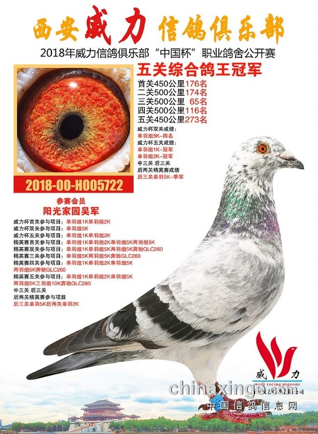 西安威力俱乐部职业化赛鸽大奖赛,已经成为继北京之后第二大赛场,其以鲜明的中国特色、中国风格、中国气派屹立于中国西部。以独特的三线五关赛理念、独具一格的赛鸽态度、从不止步的职业化赛鸽事业探索,全新地推动赛鸽运动进步与发展,并创造了惊人的巨大吸引力,给西安传统的信鸽产业带来全新的生命和活力。其公平、公正、公开、透明一直走在鸽界前面,以赛线难度和变换赛线的五关赛勇立潮头,吸引了众多的全国各地区赛鸽强豪前来参战。院内9棚,院外50棚,共计59户职业化团队参赛。