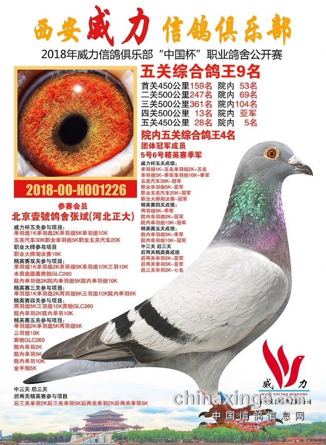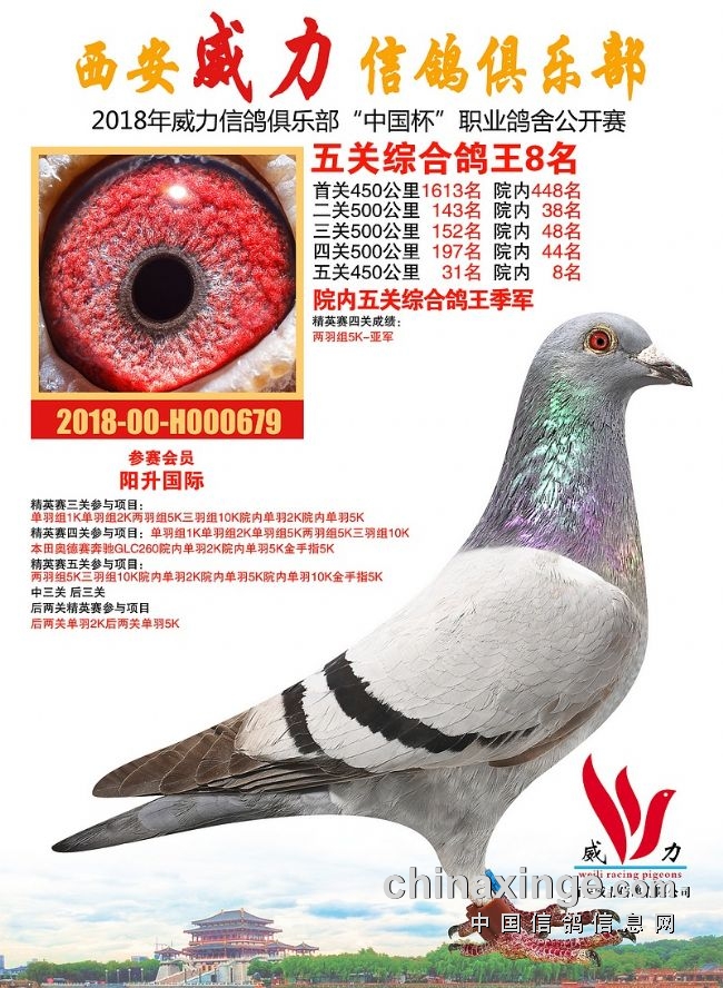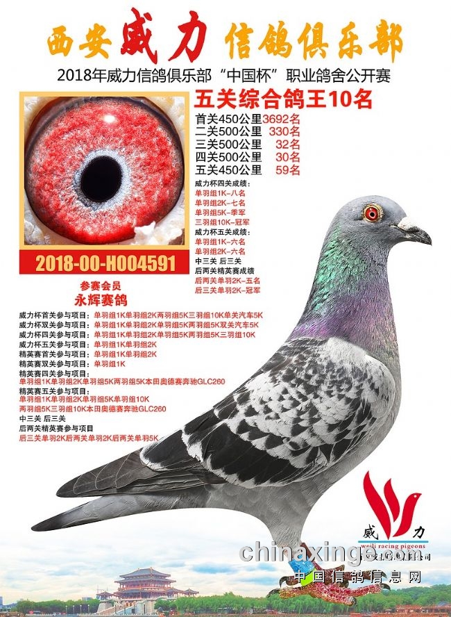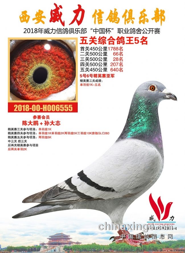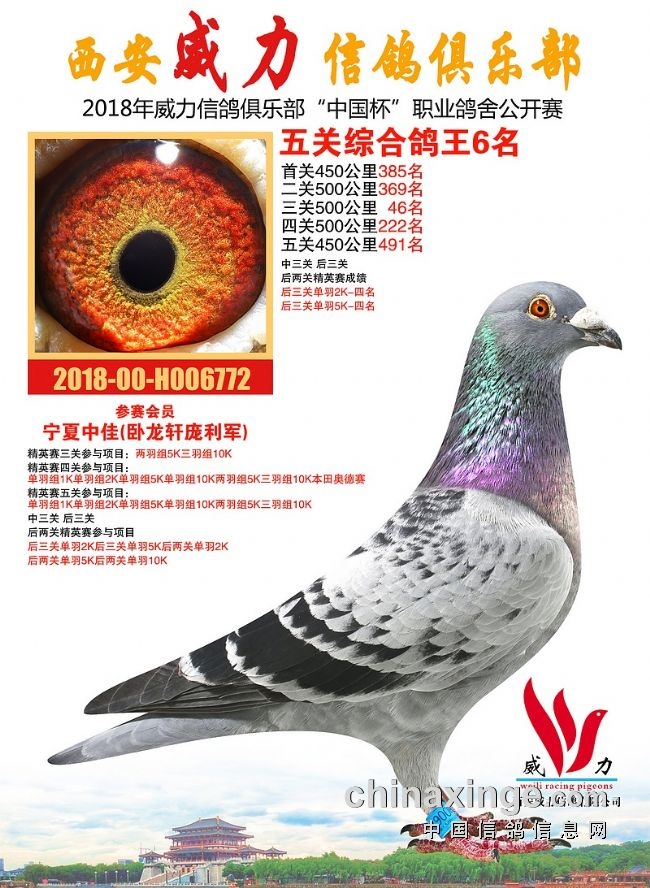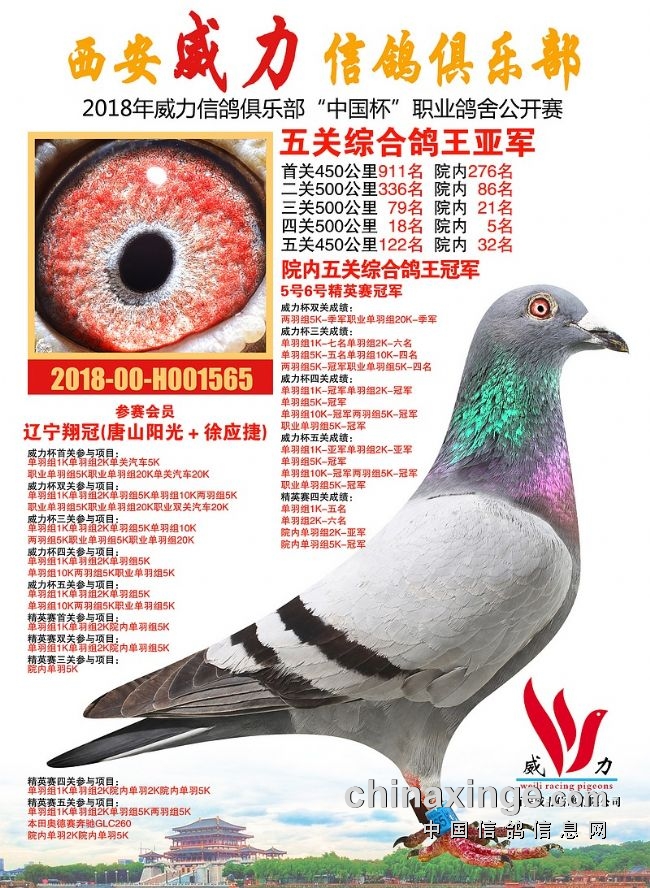 狼烟起南北,威力杀破狼!西安威力信鸽俱乐部自2016年开始,首次开启联盟团队4.0时代,高起点走在西北赛场最前沿,引领了西北赛场的国际化进程。三向赛线五关赛事,结合当地秋季不稳定的恶劣天气,更是首创挑战了西北赛鸽难度巅峰。2017年排除万难,以执着的杀破狼精神,勇往直前,继续挑战赛鸽的新时代。16年200名、17年180名,2018年是一个质的提升,售环近万枚,增设奖金至682名。最终幼检注册7643羽,59户,有效率87%。第一关集鸽5975羽,59户,归巢率86.56%.第二关集鸽5093羽,59户,归巢率73.02%。第三关集鸽3688羽,59户,归巢率60.98%。第四关集鸽2207羽,58户,归巢率90.30%。第五关集鸽1965羽,58户,归巢率90.74%。所有赛事均由中鸽协委派国家级裁判和西安市信鸽协会裁判监赛,威力一直秉承家训:“做人要正 待人要诚 做事要公”,并且时刻提醒鸽友:“不要因为参加信鸽比赛,影响家庭经济生活”!