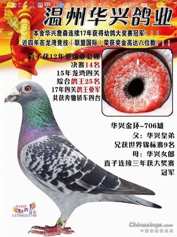 “华兴金环706”是从来没参赛过的特留种鸽,它强大的遗传基因,把华兴詹森麦克斯血脉发挥得淋漓尽致,直接作出的代表子代有: