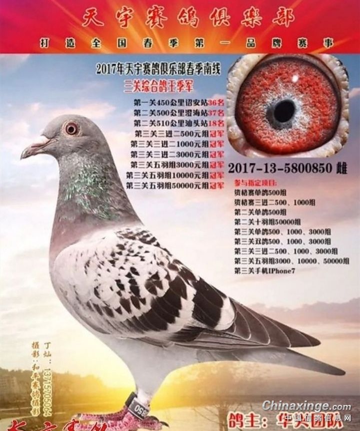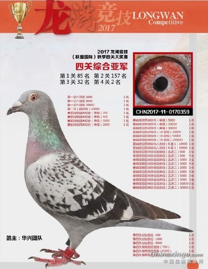 2017年温州龙湾竞技(联盟国际)四关综合鸽王亚军,赛前暗插一条龙指定冠军,得17项冠军,2项亚军,4项季军,3项殿军,获得奔驰两台,共获奖金700多万;