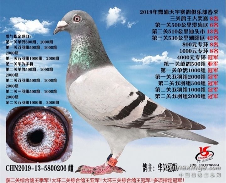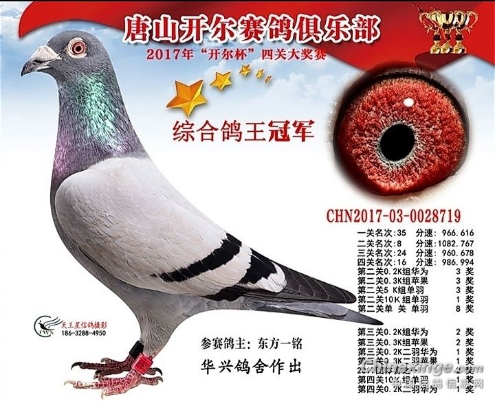 2017年唐山开尔寄养棚院内外四关综合总冠军,5项指定冠军,3项指定亚军,3项指定季军。2019年福建天宇赛鸽俱乐部春季三关综合鸽王大环冠军,6项指定冠军,1项指定亚军等等。