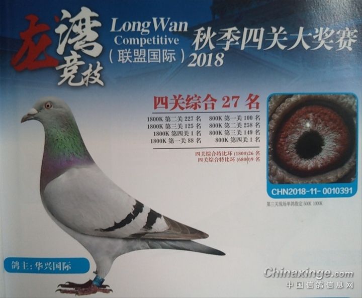 2018年温州龙湾竞技(联盟国际)四关综合鸽王27名,第四关冠军。
