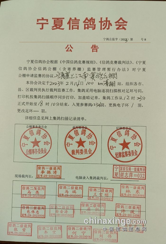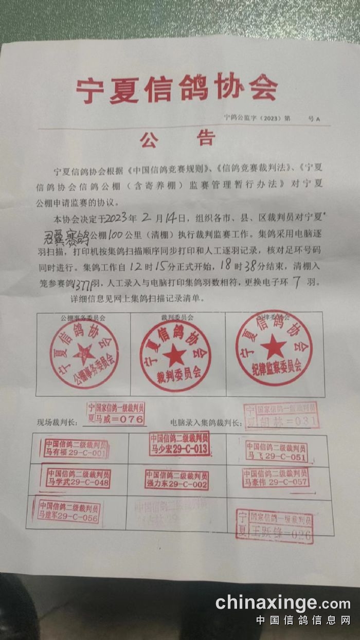 宁夏君翼赛鸽公棚(春棚)100公里清棚收费站于2月14日进行集鸽,共计上笼13771羽赛鸽,2月15日上午9:03,比赛在甘肃庆阳环县开笼放飞。比赛数据直播>>