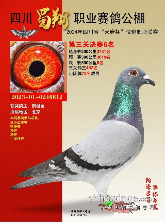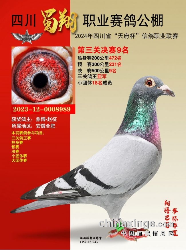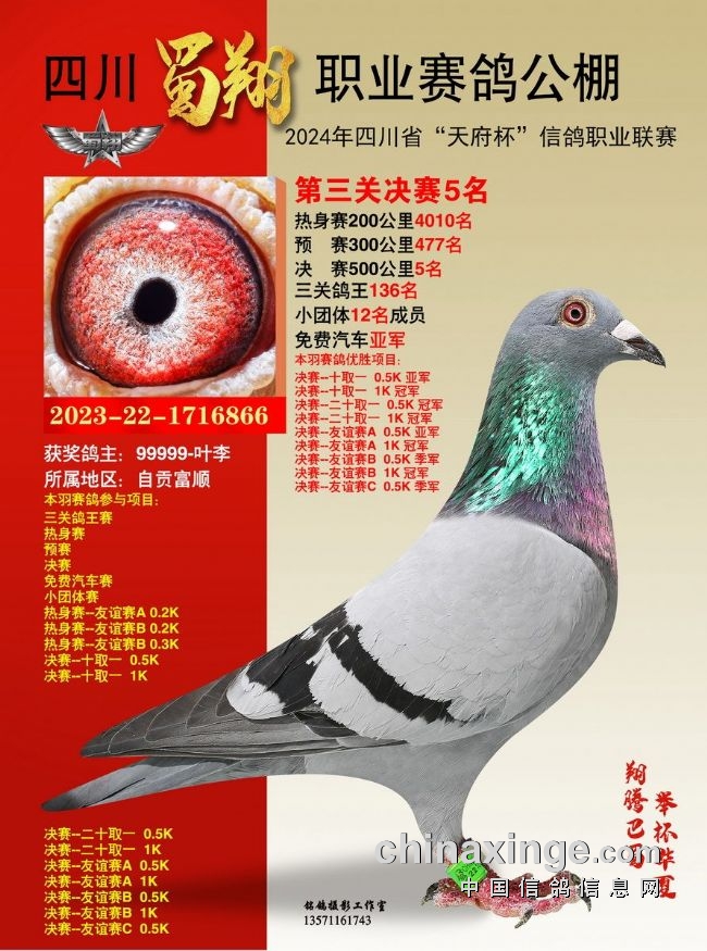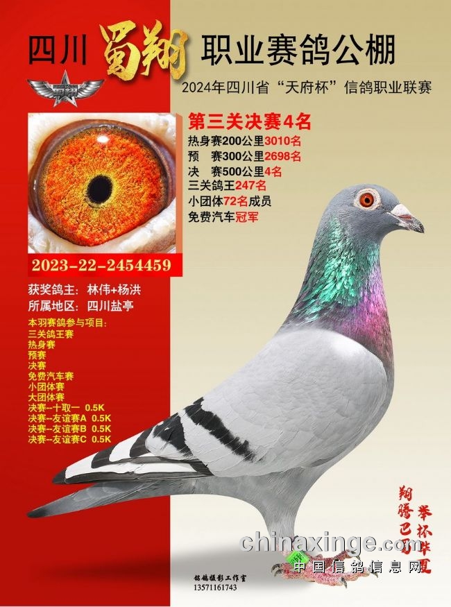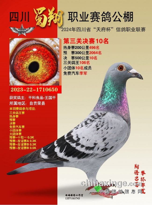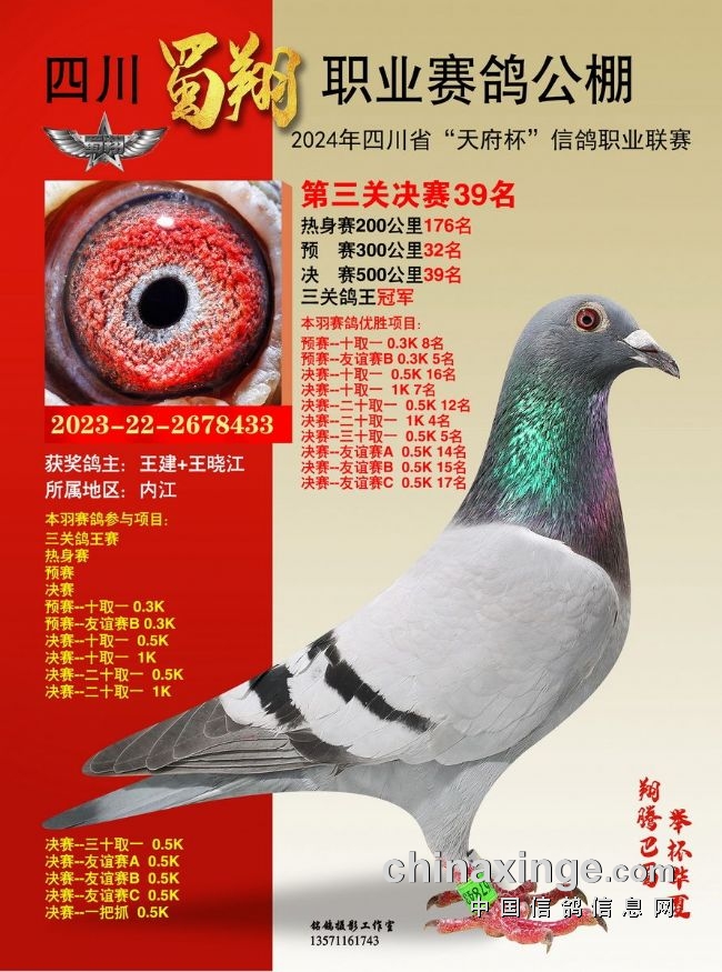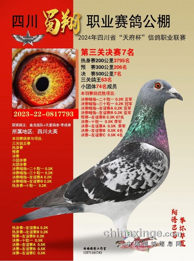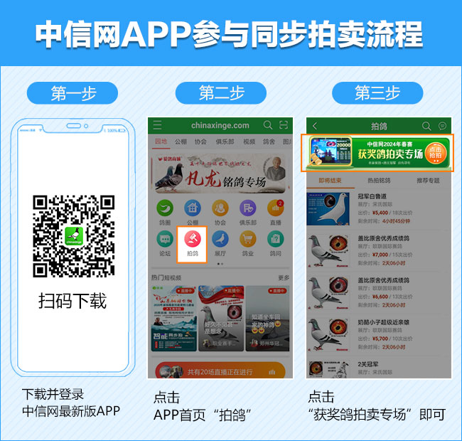2024年6月23-24日,四川蜀翔职业赛鸽公棚将举行获奖鸽颁奖暨拍卖大会,同时联合中国信鸽信息网推出“现场与网络同步拍卖+视频直播”服务,鸽友们可登录中信网,提前出价看好鸽。边看直播边竞价,优秀奖鸽带回家!即刻下载中信网手机APP,轻松出价,快人一步!
