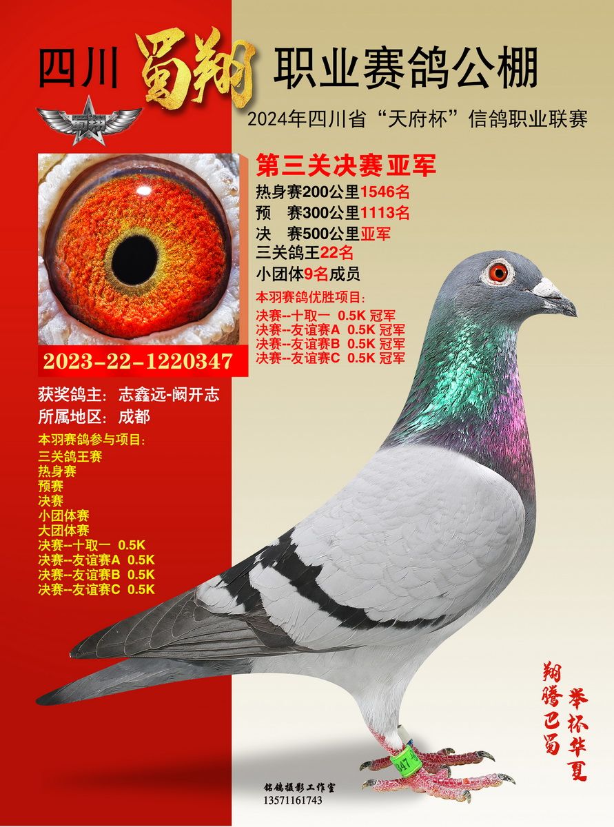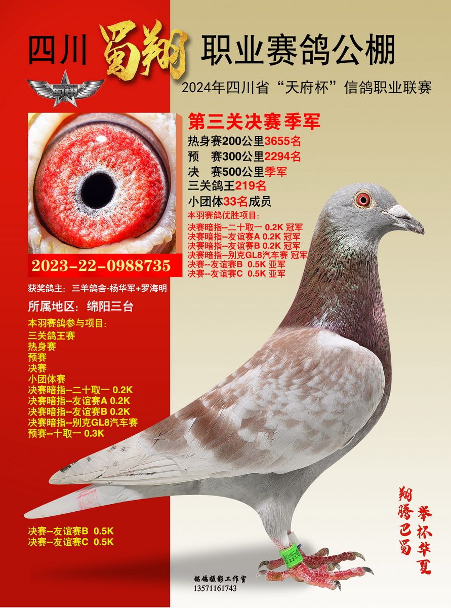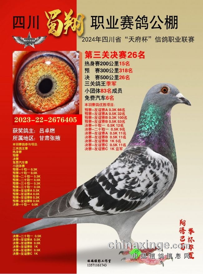 王建+王晓江的22-2678433灰鸽在艰难的三关比赛中,翻山越岭,始终保持在归巢鸽的第一梯队,分别获得热身赛176名、预赛32名、决赛39名,以3583.25747米/分的综合分速,赢得三关鸽王冠军。鼎博-赵征的12-0008989灰白条飞了热身赛472名、预赛231名,在决赛中超常发挥,进入前10名,荣获9名,最终以3560.26391米/分的综合分速,赢得三关鸽王亚军。吕卓燃的22-2676405雨点鸽热身赛15名、预赛318名、决赛26名,综合分速3556.79429米/分,获得三关鸽王季军。
