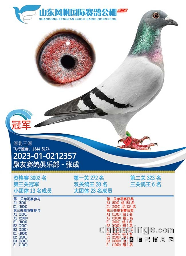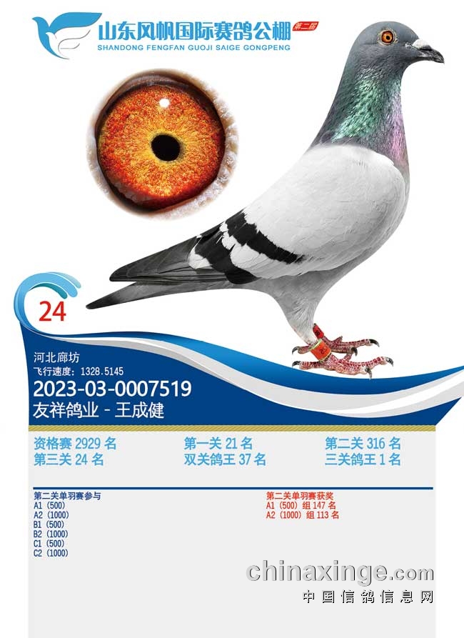 河北廊坊名家友祥鸽业-王成建的2023-03-0007519灰鸽,三关比赛飞出了21、316、24名的优异成绩,赢得三关鸽王冠军。