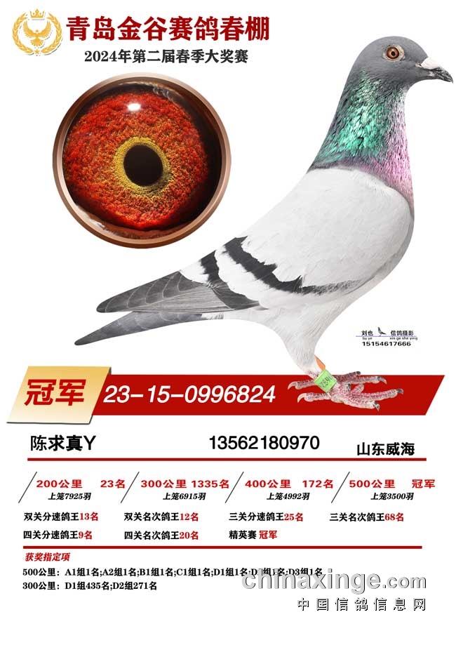 2.青岛金谷春棚2024年春赛,收鸽13777羽,100公里收费站上笼8832羽,决赛上笼3500羽,归巢率超65%。山东威海陈求真的2023-15-0996824灰白条成为今年的最佳,四关比赛200公里23名、300公里1335名、400公里172名、决赛获得冠军,并且拿下四关分速鸽王9名、精英赛冠军。