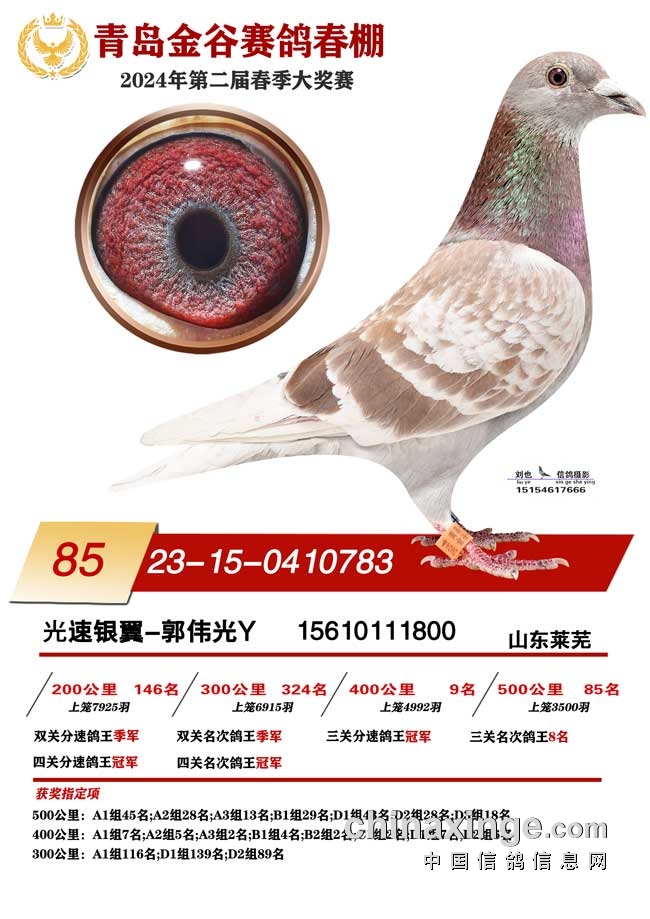 山东莱芜光速银翼-郭伟光的2023-15-0410783红绛鸽,四关比赛成绩超级出色,200公里146名、300公里324名、400公里9名、决赛85名,赢得双关鸽王季军,三关鸽王冠军、四关鸽王冠军。