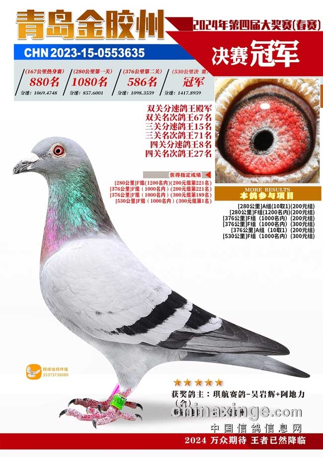 3.青岛金胶州春棚2024年春赛,收鸽超10000羽,100公里收费站上笼9072羽,决赛上笼3494羽。山东滨州琪航赛鸽-吴岩辉+阿地力的2023-15-0553635砂眼灰鸽,荣获冠军,飞行分速1417.8959米/分。