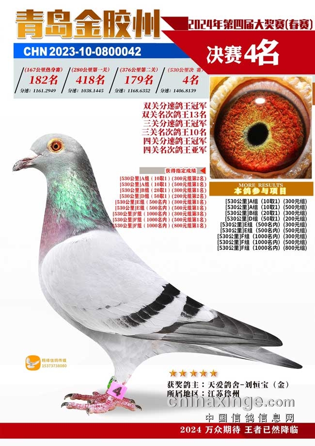 江苏徐州天爱鸽舍-刘恒宝的2023-10-0800042黄眼灰鸽四关比赛均入围前420名,一关182名、二关418名、四关179名、四关4名,包揽双关、三关、四关分速鸽王三项总冠军头衔,同时也为鸽主拿下了多项娱乐赛冠军。