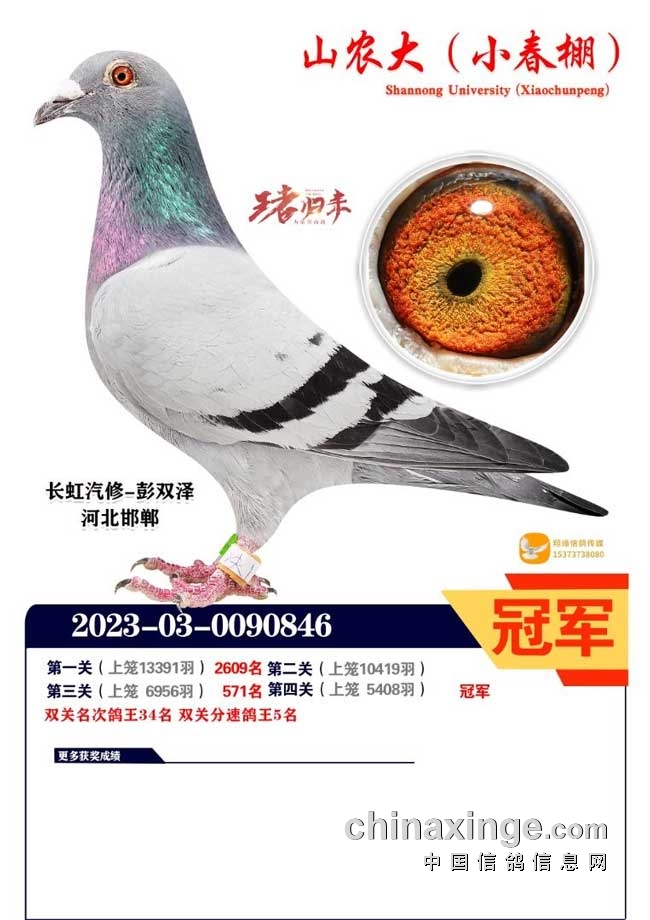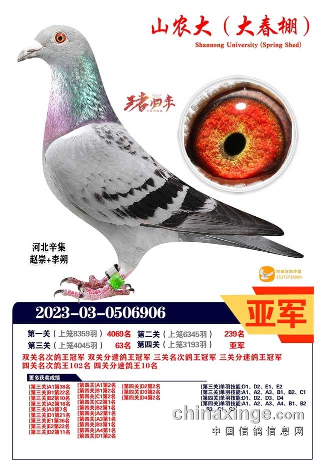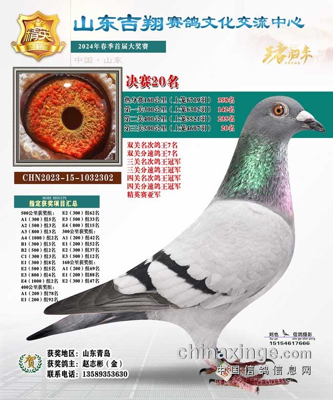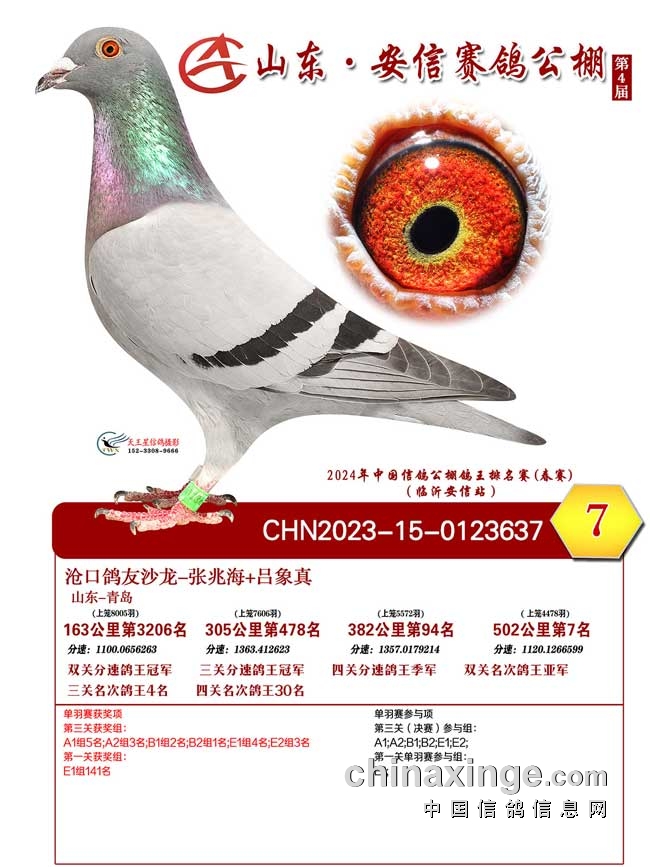 山东青岛沧口鸽友沙龙-张兆海+吕象真的2023-15-0123637黄眼灰鸽,第一关305公里478名、第二关382公里94名、第三关502公里决赛7名,赢得双关、三关分速鸽王冠军。