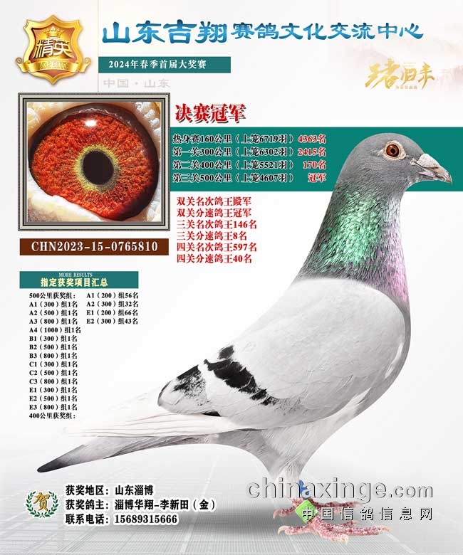 5.山东吉翔春棚2024年第一届春赛,收鸽15256羽,100公里收费站上笼7503羽,决赛上笼4607羽。山东淄博淄博华翔-李新田的2023-15-0765810黄眼灰白条赛鸽前两关飞的一般400公里开始发挥,获得170名。决赛中,鸽主对它充满信任,打了多项娱乐赛,最终不负众望,拿下冠军、双关鸽王冠军。