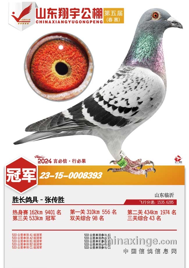 6.山东翔宇春棚2024年第五届春赛,收鸽17921羽,100公里收费站上笼13306羽,决赛上笼4596羽。山东临沂胜长鸽具-张传胜的2023-15-0008393黄眼雨点鸽很有特点,一关快一关稳,最终决赛赢得冠军。