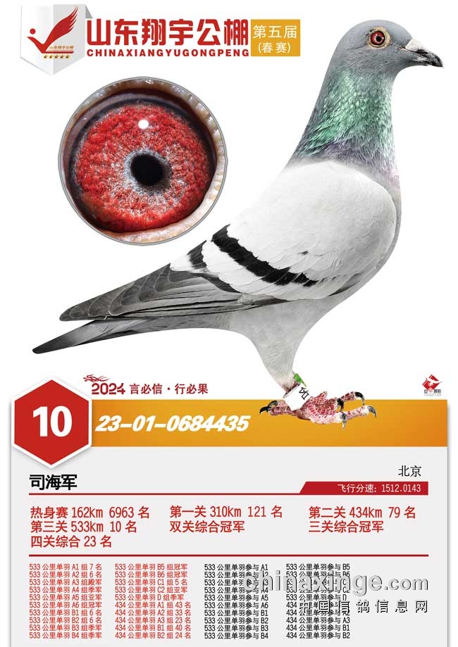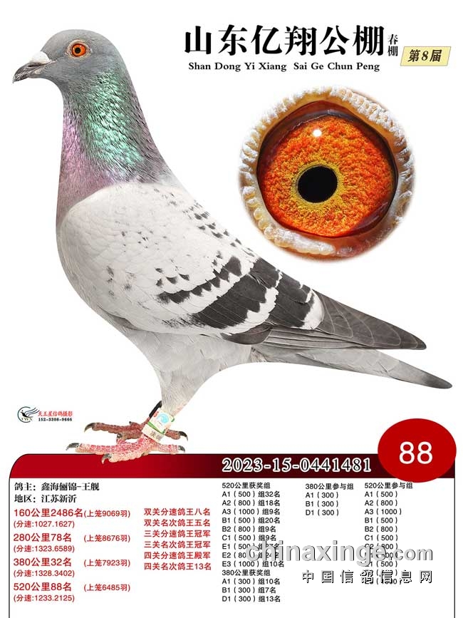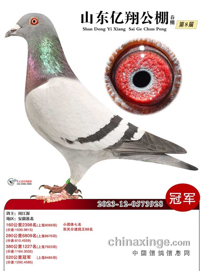8.山东亿翔赛鸽公棚2024年第八届春赛,收鸽13918羽,100公里收费站上笼10334羽,决赛上笼6485羽。安徽淮北周江源的2023-12-0573928砂眼灰鸽在前三场在1000名之外,决赛中爆发,成功逆袭,赢得冠军。江苏新沂鑫海俪锦-王舰的2023-15-0441481黄眼雨点三关正赛均入前100名,一关280公里78名、二关380公里32名、三关520公里88名,赢得三关鸽王冠军。