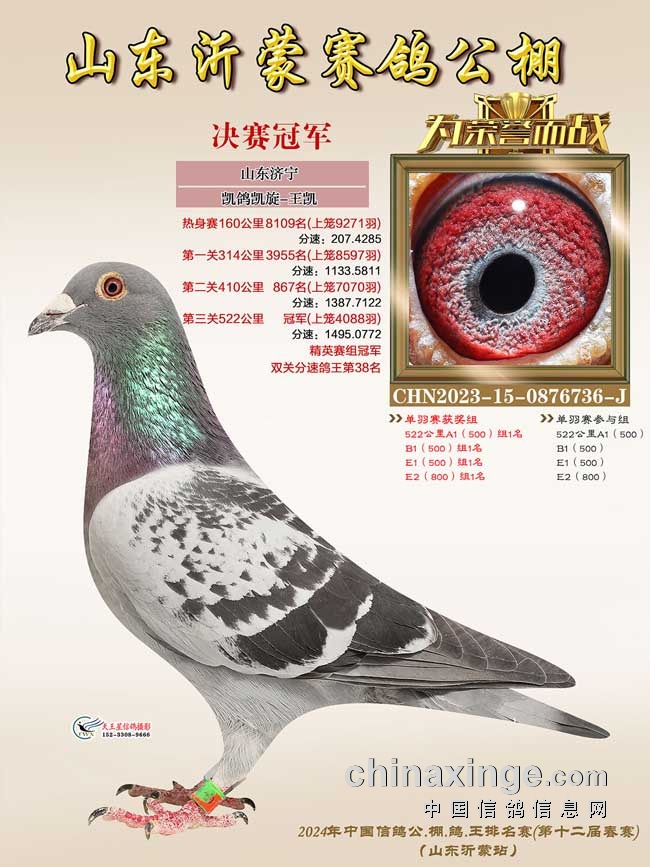 7.山东沂蒙赛鸽春棚2024年第十二届春赛,100公里收费站上笼11375羽,决赛上笼4088羽。山东济宁凯鸽凯旋-王凯的2023-15-0876736白砂眼雨点鸽热身赛落在了最后,但进入第一关之后,越飞越快,名次也越来越好,最终以1495.0772米/分的成绩,荣获决赛冠军,同时拿下精英赛冠军。
