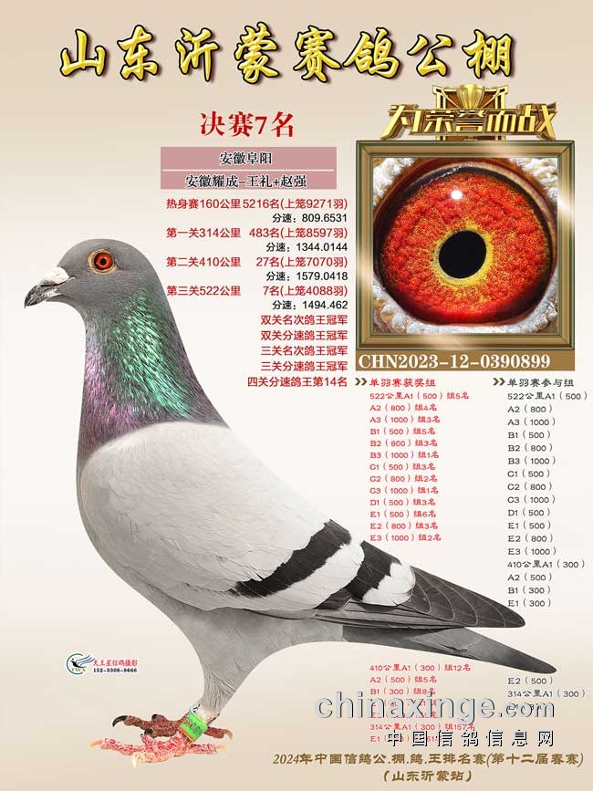 安徽阜阳安徽耀成-王礼+赵强的2023-12-0390899黄眼灰鸽凭借后三关比赛的优异表现,获得一关483名、二关27名、三关7名,赢得双关鸽王冠军、三关鸽王冠军。