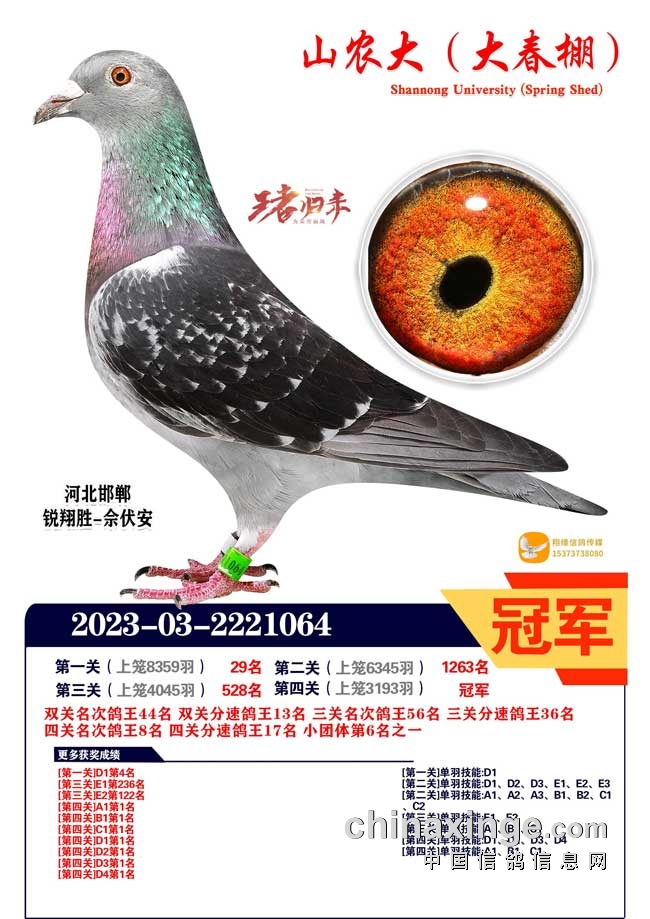 9.山农大大春棚2024年举办首届春赛,收费1999元/羽,收鸽羽数达14500羽,收费站上笼9690羽,决赛上笼3193羽。河北邯郸锐翔胜-佘伏安的2023-03-2221064黄眼雨点鸽一路过关斩将,一关29名、二关1263名、三关528名、四关冠军,表现出色。河北辛集赵崇+李朔的2023-03-0506906黄眼雨点鸽后三关发挥出超强战力,第二关239名、第三关63名、决赛亚军,赢得双关鸽王冠军、三关鸽王冠军。