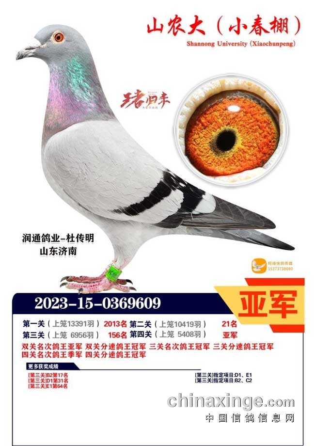 山东济南润通鸽业-杜传明的2023-15-0369609黄眼灰鸽四关比赛既快又稳,第一关最大羽数13391羽2013名,第二关10419羽21名,第三关6956羽156名,第四关决赛5408羽荣获亚军,独揽双关、三关、四关分速鸽王总冠军。